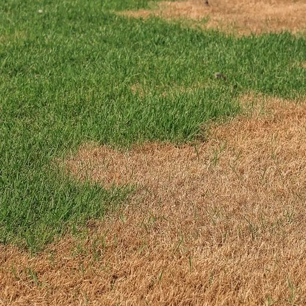 Grub damage usually starts with irregular brown patches and can be mistaken for fungal disease.